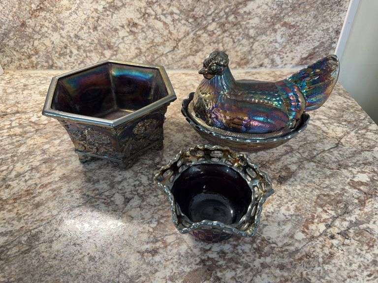 LOT 70 - Fenton carnival glass hen on nest and bowls
